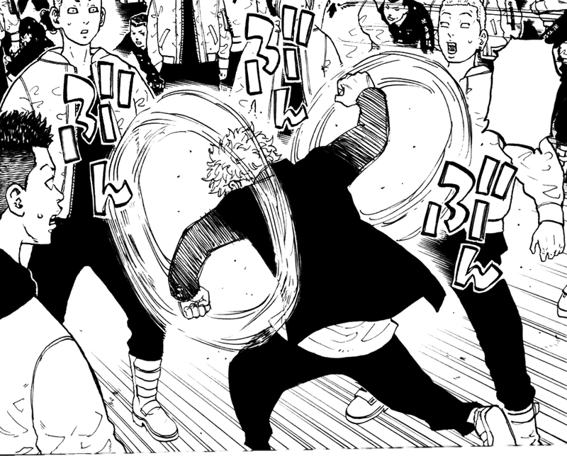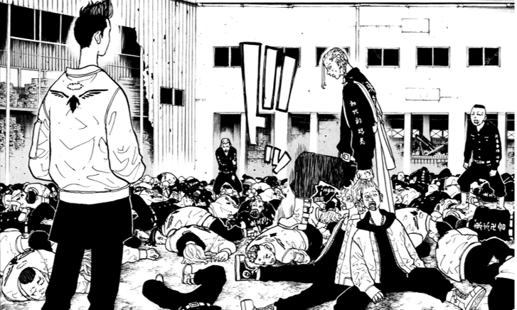 Suddenly, they are distracted by a roar coming from Takemichi, who is beat nearly unconscious, but continues fighting, determined to win. As he sways, unbalanced, Takemichi makes drive to win clear. Mitsuya catches an unconscious Takemichi, commenting how he is impressed. Takemichi's determination despite his subpar fighting skills spur the Toman members to regain their resolve, and Draken successfully fights his way towards Hanma.