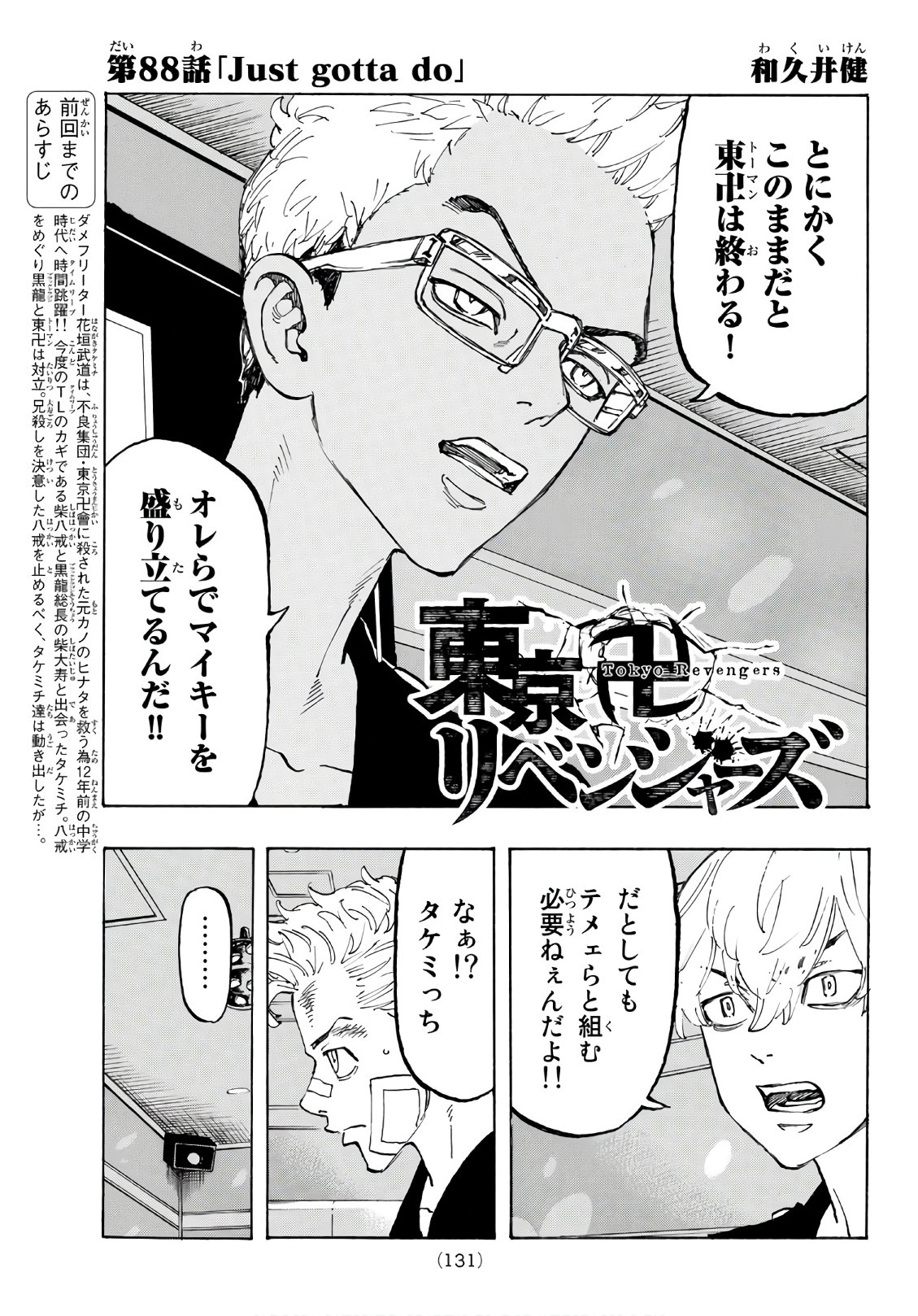 "Just gotta do" is the ninth chapter of the 10th volume and the 88th chapter overall of the Tokyo卍Revengers manga series, written and illustrated by Ken Wakui.